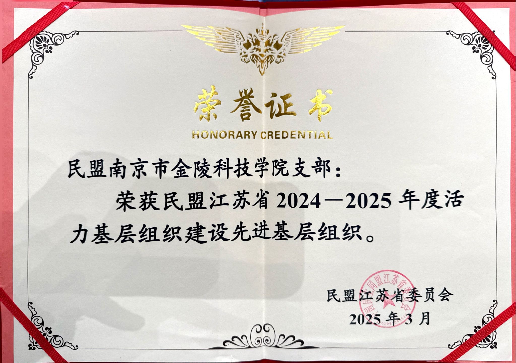 近日,民盟江苏省委员会正式发文表彰,民盟南京市金陵科技学院支部凭借扎实的组织建设、活跃的履职氛围与突出的工作成效,荣获民盟江苏省 2024——2025 年度活力基层组织建设先进基层组织称号,这是支部在思想政治建设、组织建设、履职尽责等多方面工作取得的重要成果,也是对支部长期以来各项工作的高度肯定。